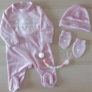 #15 Sortie clinique personnalisée naissance ou 3 mois en velours – 6 pièces