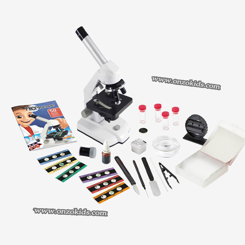 o Nombreux accessoires inclus: 2 oculaires 10x et 25x, lamelles, pince, flacons, colorant, agitateur, étiquettes, boite de Petri, micro trancheuse…